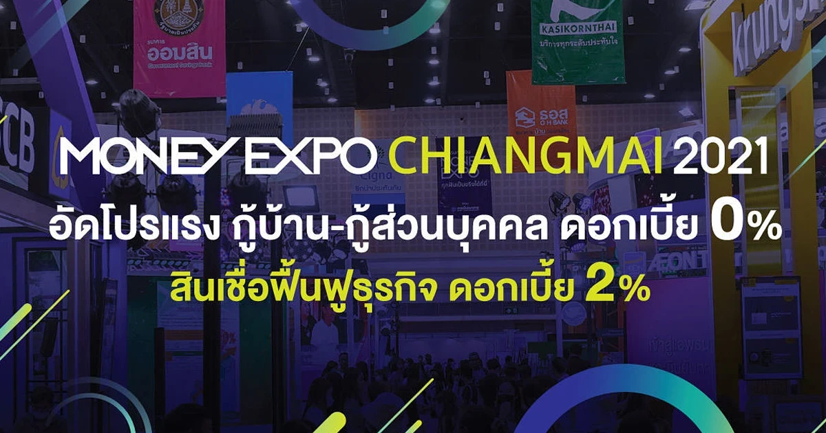 งานมหกรรมการเงินเชียงใหม่ ครั้งที่ 16 Money Expo Chiangmai 2021 วันที่12-14 พฤศจิกายน 2564 ที่ เซ็นทรัลพลาซา เชียงใหม่ แอร์พอร์ต จ.เชียงใหม่ ทุ่มแคมเปญพิเศษส่งท้ายปี สินเชื่อบ้าน ดอกเบี้ย 0% นาน 6 สินเชื่อบุคคล อัตราดอกเบี้ย 0% นาน 6 เดือน สินเชื่อฟื้นฟูธุรกิจดอกเบี้ย 2% นาน 10 ปี เงินฝากปลอดภาษี 24 เดือน อัตราดอกเบี้ย 1.3% ต่อปี ทรัพย์ NPA ราคาลดสูงสุด 60% ซื้อประกันชีวิตรับทองคำแท่ง 9 บาท/ iPhone 13 Pro Max พร้อมเข้มมาตรการป้องกันและเข้าชมงานแบบ "นิวนอร์มอล" ฟรี! สัมมนา "เปิดธีมหุ้นเด่น ผลักดันดัชนี ปี 2565"
