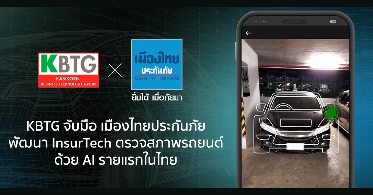 KBTG ร่วมกับ เมืองไทยประกันภัย พัฒนาแพลตฟอร์ม InsurTech นำเทคโนโลยี AI เข้ามาช่วยเพิ่มประสิทธิภาพระบบตรวจสภาพรถยนต์ก่อนทำประกันภัยแบบ Self Service รายแรกในไทยบนดิจิทัลแพลตฟอร์ม สร้างประสบการณ์ใหม่ให้กับลูกค้า ใช้เวลาเพียงไม่กี่นาทีผ่านระบบออนไลน์ที่ใช้งานง่ายได้ตลอด 24 ชั่วโมง