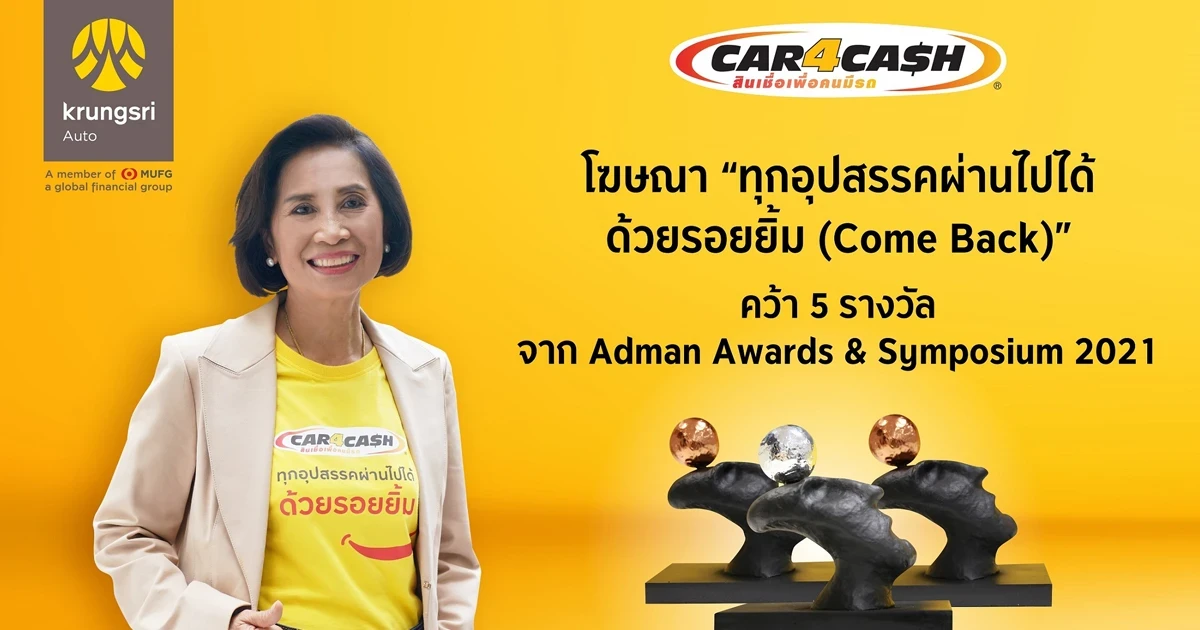 ภาพยนตร์โฆษณา คาร์ ฟอร์ แคช “ทุกอุปสรรคผ่านไปได้ด้วยรอยยิ้ม (Come Back)” ที่ร่วมสร้างสรรค์โดยกรุงศรี ออโต้ TBWAThailand และ Suneta House คว้า 5 รางวัลจากงาน Adman Awards & Symposium 2021 สะท้อนถึงกลยุทธ์การสื่อสารการตลาดที่โดดเด่น ด้วยการนำเสนอผลงานสร้างสรรค์ที่น่าจดจำและร่วมสมัย ควบคู่ไปกับการตอบโจทย์ทางธุรกิจอย่างมีประสิทธิภาพ