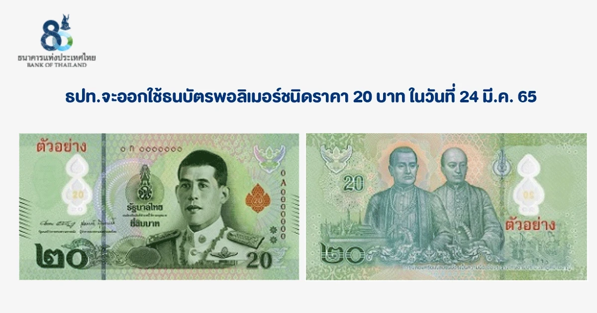 ธนบัตรพอลิเมอร์ ชนิดราคา 20 บาท จะเริ่มออกใช้หมุนเวียนในวันที่ 24 มีนาคม 2565 นี้ โดยประชาชนสามารถเบิกถอนผ่านสาขาธนาคารพาณิชย์และสถาบันการเงินเฉพาะกิจทุกแห่ง สำหรับธนบัตรกระดาษ ชนิดราคา 20 บาท ที่ใช้หมุนเวียนอยู่ในปัจจุบัน ยังคงสามารถใช้จ่ายได้ตามปกติต่อไป