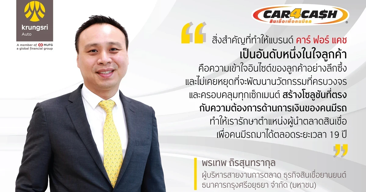 นายพรเทพ ถิรสุนทรากุล ผู้บริหารสายงานการตลาด ธุรกิจสินเชื่อยานยนต์ ธนาคารกรุงศรีอยุธยา จำกัด (มหาชน) กล่าวว่า "ตลาดสินเชื่อเพื่อคนมีรถยังคงมีแนวโน้มเติบโตต่อเนื่องจากหลายปัจจัย ทั้งความต้องการสินเชื่อที่ยังอยู่ในระดับสูง และนวัตกรรมผลิตภัณฑ์ใหม่ๆ จากผู้ให้บริการสินเชื่อ สำหรับ คาร์ ฟอร์ แคช ซึ่งเป็นแบรนด์ผู้บุกเบิกตลาดรีไฟแนนซ์รถในประเทศไทย เราให้ความสำคัญกับการพัฒนาผลิตภัณฑ์และบริการที่เข้าถึงความต้องการด้านการเงินของคนมีรถในทุกกลุ่ม ขณะเดียวกัน เรายังมุ่งมอบประสบการณ์ที่ดีในทุกจุดของ Customer Journey ซึ่งทำให้ คาร์ ฟอร์ แคช ยังคงครองตำแหน่งผู้นำตลาดมาตลอด 19 ปี ด้วยฐานลูกค้าปัจจุบัน 312,000 ราย และพอร์ตสินเชื่อมูลค่ารวม 80,220 ล้านบาท"