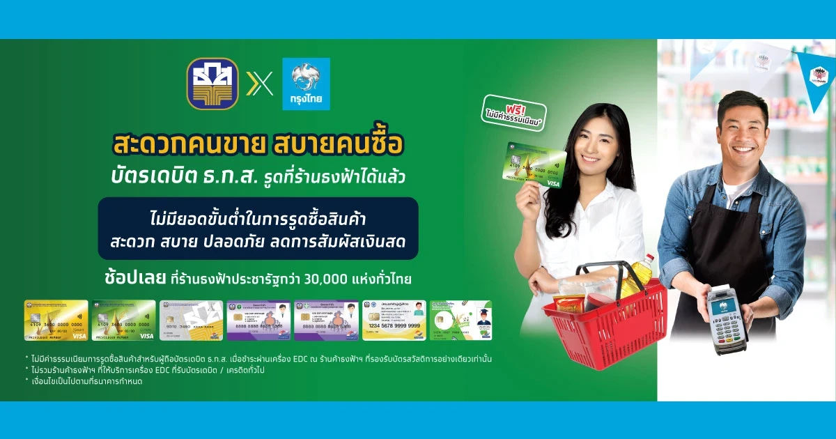 - ไม่มีค่าธรรมเนียมการรูดซื้อสินเค้าสำหรับผู้ถือบัตรเดบิต ธ.ก.ส เมื่อชำระผ่านเครื่อง EDC ณ ร้านธงฟ้าฯ ที่รองรับบัตรสวัสดิการอย่างเดียวเท่านั้น