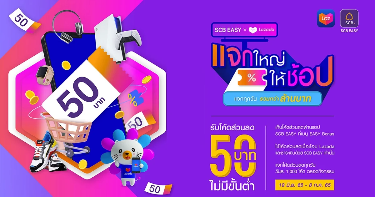 วิธีการเก็บคูปองส่วนลด Lazada 7.7 ดีลเด็ดวันเลขเบิ้ล มูลค่า 50 บาท จาก SCB EASY