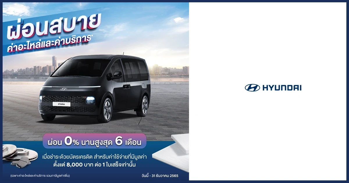 บริษัท ฮุนได มอเตอร์ (ไทยแลนด์) จำกัด เสนอแคมเปญพิเศษสำหรับค่าอะไหล่และค่าบริการ "ผ่อนสบายใจ 0% นานสูงสุด 6 เดือน" สำหรับลูกค้าที่นำรถเข้ามารับบริการที่ศูนย์บริการรถยนต์ฮุนได ตั้งแต่วันนี้ถึงวันที่ 1 กรกฎาคม ถึง วันที่ 31 ธันวาคม 2565