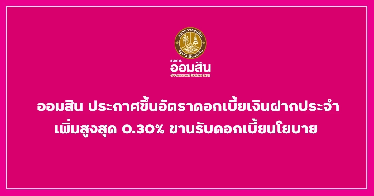 นายวิทัย รัตนากร ผู้อำนวยการธนาคารออมสิน เปิดเผยว่า จากการที่คณะกรรมการนโยบายการเงิน(กนง.) ได้มีการปรับขึ้นอัตราดอกเบี้ยนโยบาย จาก 0.50% ต่อปี เป็น 0.75% ต่อปี มีผลเมื่อวันที่ 10 สิงหาคม 2565 เป็นต้นไปนั้น เพื่อเป็นการดูแลผู้ฝากเงินให้ได้รับประโยชน์จากอัตราดอกเบี้ยขาขึ้นธนาคารออมสิน ซึ่งมีภารกิจหลักในการเป็นสถาบันการเงินเพื่อการออม จึงประกาศขึ้นอัตราดอกเบี้ยเงินฝากประจำ 3 เดือน/6 เดือน ปรับขึ้น 0.15% เงินฝากประจำ 12 เดือน ปรับขึ้น 0.20% และเงินฝากประจำ 24 เดือน / 36 เดือน ปรับขึ้น 0.30% ซึ่งจะช่วยส่งเสริมการออม และให้ประชาชนได้มีกำลังซื้อเพิ่มมากขึ้นในช่วงที่กำลังเริ่มกลับมามีกิจกรรมทางเศรษฐกิจ