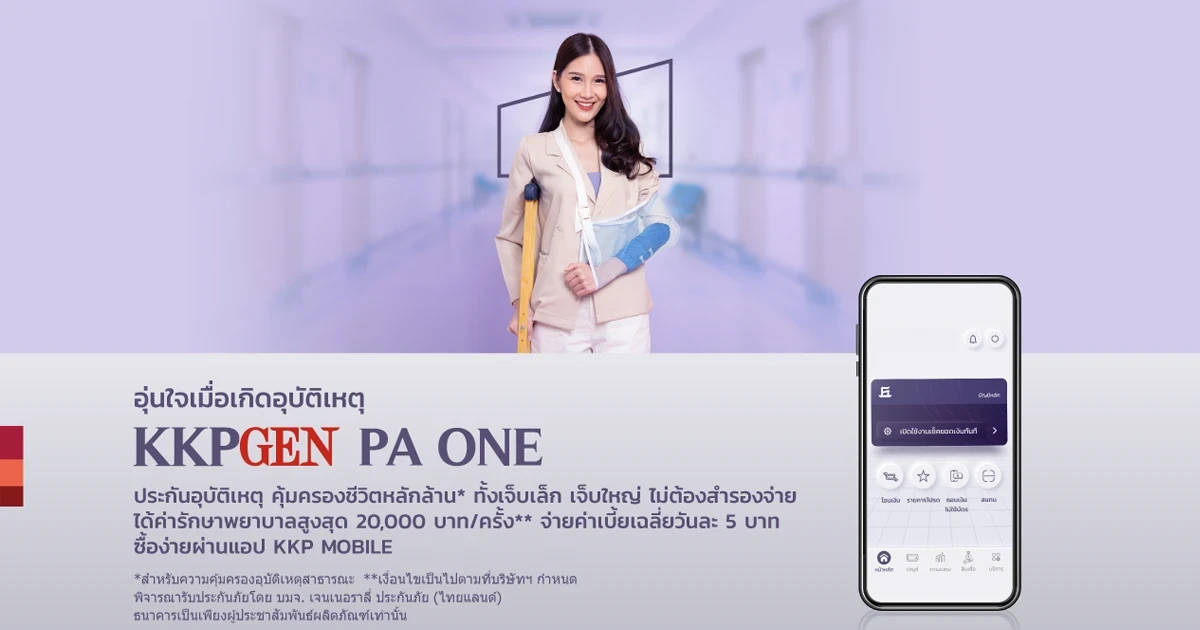 สำหรับ เคเคพีเจน พีเอ วัน (KKPGEN PA ONE) เป็นประกันภัยอุบัติเหตุส่วนบุคคลที่ตอบโจทย์วัยรุ่นและวัยทำงาน สมัครง่าย รวดเร็ว ไม่ต้องตรวจสุขภาพ รับประกันภัยตั้งแต่อายุ 14 วัน – 60 ปี และสามารถต่ออายุได้ถึง 65 ปี โดยให้ความคุ้มครองอุบัติเหตุในหลากหลายรูปแบบ อาทิ อุบัติเหตุทั่วไป อุบัติเหตุสาธารณะ การขับขี่หรือโดยสารรถจักรยานยนต์ การถูกฆาตกรรมหรือถูกทำร้ายร่างกาย การจลาจล รวมไปถึงการก่อการร้าย เพิ่มความอุ่นใจให้กับชีวิตด้วยประกันความคุ้มครองสูงสุดหลักล้าน สำหรับอุบัติเหตุทั่วไปคุ้มครอง 600,000 บาท อีกทั้งมอบความคุ้มครองพิเศษกรณีอุบัติเหตุสาธารณะสูงถึง 1,200,000 บาท พร้อมมอบค่ารักษาพยาบาลเนื่องจากอุบัติเหตุสูงสุด 20,000 บาทต่อครั้ง หมดกังวลกับการเลือกโรงพยาบาล ไม่ต้องสำรองจ่าย ด้วยเครือข่ายสถานพยาบาลและคลินิกคุณภาพชั้นนำกว่า 500 แห่งทั่วประเทศ ค่าเบี้ยประกันรายปีเพียง 1,700 บาท หรือเฉลี่ยเพียงวันละ 5 บาท เท่านั้น