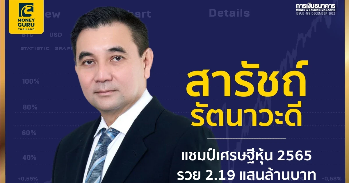 "สารัชถ์ รัตนาวะดี" ครองหุ้นกัลฟ์ (GULF) ขึ้นแท่นแชมป์เศรษฐีหุ้นไทยปี 2565 รวย 2.19 แสนล้านบาท ครองแชมป์เศรษฐีหุ้นไทย 4 ปีซ้อน "ปณิชา ดาว" กลุ่มทุนจาก สปป.ลาว ครองอันดับ 2 ถือหุ้นพีเอสจี คอร์ปอเรชั่น (PSG) รวมมูลค่า 8.16 หมื่นล้านบาท "หมอเสริฐ" นพ.ปราเสริฐ ปราสาททองโอสถ นั่งเศรษฐีหุ้นอันดับ 3 ถือหุ้นบางกอกแอร์เวย์ส (BA) - กรุงเทพดุสิตเวชการ (BDMS) รวมมูลค่า 6.27 หมื่นล้านบาท "ตระกูลรัตนาวะดี" ครองแชมป์ตระกูลเศรษฐีหุ้นไทย ทำสถิติใหม่ความมั่งคั่งมูลค่าสูงสุด 2.19 แสนล้านบาท