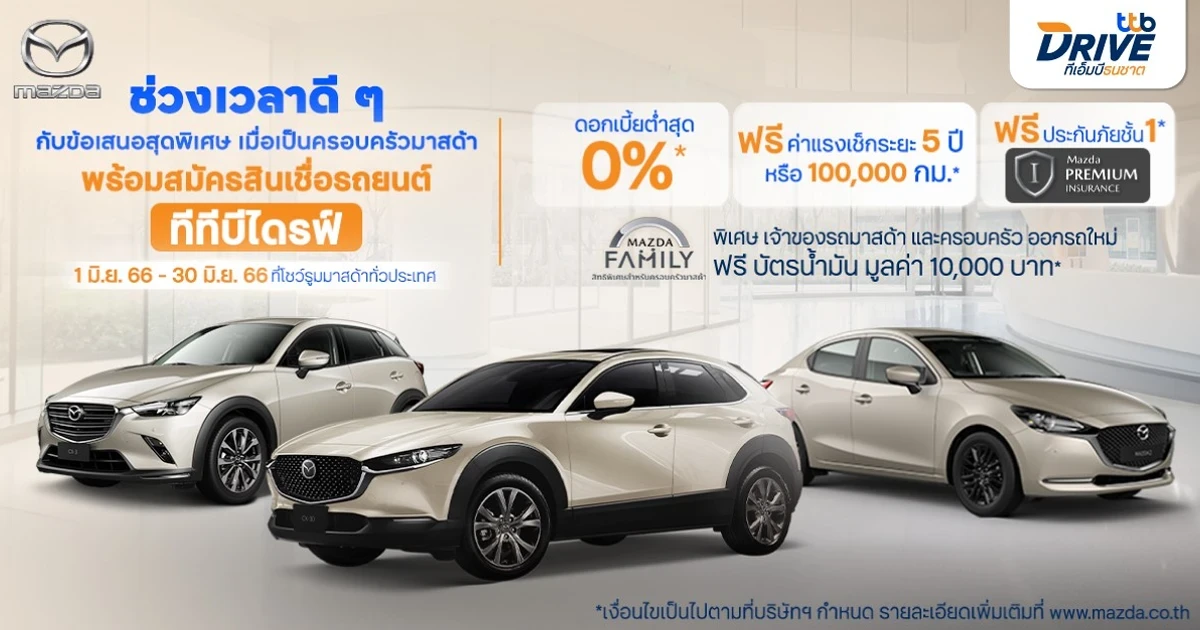 ทีทีบีไดรฟ์ โดย ทีเอ็มบีธนชาต ตอกย้ำความเป็นผู้นำเรื่องสินเชื่อรถยนต์ จับมือพันธมิตรค่ายรถยนต์มาสด้า ร่วมส่งมอบความสุขให้กับลูกค้าที่สนใจรถยนต์มาสด้า รวมทั้งมอบสิทธิพิเศษมากมายสำหรับลูกค้าปัจจุบัน ด้วยโปรโมชันแบบจัดเต็ม จัดรายการส่งเสริมการขายสำหรับรถยนต์รุ่น NEW MAZDA2, NEW MAZDA CX-3 และ NEW MAZDA CX-30 ด้วยอัตราดอกเบี้ยสุดพิเศษ 0% เมื่อจัดสินเชื่อรถยนต์กับทีทีบีไดรฟ์
