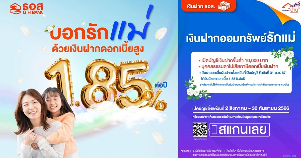 ธนาคารอาคารสงเคราะห์ (ธอส.) เปิดตัวผลิตภัณฑ์เงินฝากรับเทศกาลวันแม่ปี 2566 กับ "เงินฝากออมทรัพย์รักแม่" เพื่อเป็นการสนับสนุนการออมเงินของประชาชน และการมีส่วนร่วมในการทำให้คนไทยมีบ้าน โดยเปิดบัญชีเงินฝากขั้นต่ำ 10,000 บาทขึ้นไป ตั้งแต่วันที่ 2 ส.ค. - 30 ก.ย. 66 หรือจนกว่าจะเต็มกรอบวงเงินโครงการ