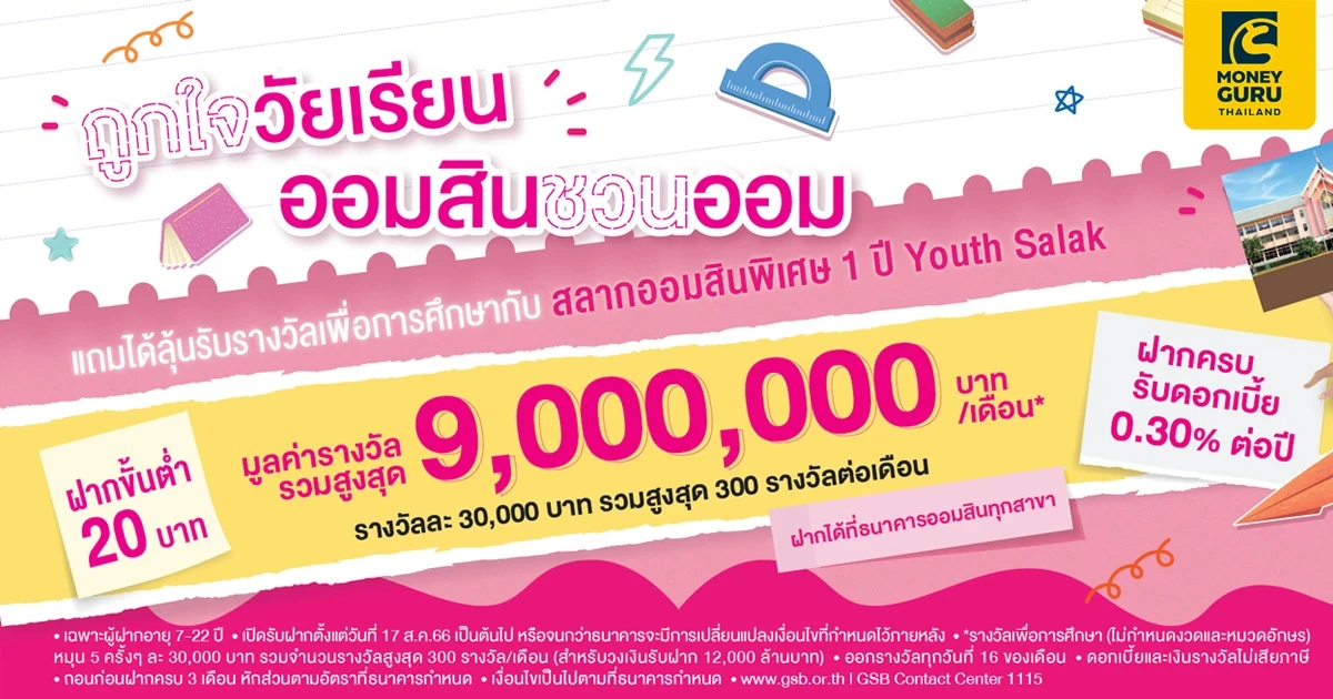 ถูกใจวัยเรียน ธนาคารออมสินชวนออม แถมได้ลุ้นรับรางวัลเพื่อการศึกษากับ สลากออมสินพิเศษ 1 ปี Youth Salak ฝากขั้นต่ำเพียง 20 บาท ฝากครบรับดอกเบี้ย 0.30% ต่อปี มูลค่ารางวัลรวมสูงสุด 9 ล้านบาท/เดือน