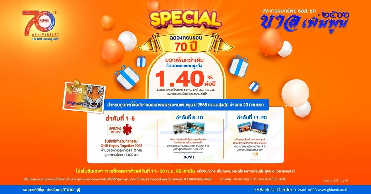 ธนาคารอาคารสงเคราะห์ (ธอส.) ฉลองครบรอบ 70 ปี จัดโปรโมชันเอาใจคนรักการออม เพียงซื้อ "สลากออมทรัพย์ ชุดขาลเพิ่มพูน ปี 2566" ตั้งแต่วันที่ 11-30 กันยายน 2566 หรือจนกว่าจะเต็มกรอบวงเงินโครงการก่อนสิ้นสุดระยะเวลาดังกล่าว ผ่านช่องทาง Mobile Application : GHB ALL GEN และ ธอส. ทุกสาขาทั่วประเทศ จำหน่ายหน่วยละ 1,000 บาท ฝากครบ 3 ปี รับผลตอบแทนหน้าสลากเพิ่มขึ้นอีก 0.25% ต่อปี หรือ สูงถึง 1.40% ต่อปี (เงื่อนไขรับผลตอบแทนเป็นไปตามที่ธนาคารกำหนด)
