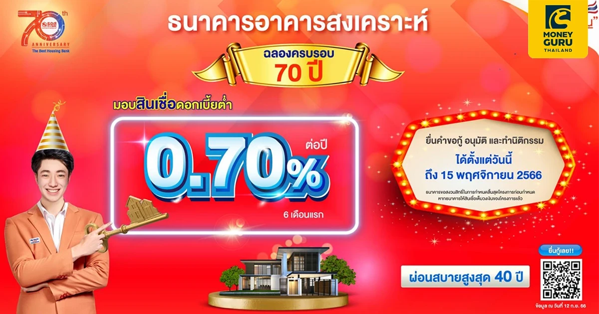 ธนาคารอาคารสงเคราะห์ (ธอส.) ฉลองครบรอบ 70 ปี มอบโปรโมชันสินเชื่ออัตราดอกเบี้ยต่ำ เอาใจคน อยากมีบ้าน กับ “สินเชื่อบ้าน 70 ปี ธอส.” กรอบวงเงินรวม 10,000 ล้านบาท สำหรับลูกค้าที่ต้องการสินเชื่อ เพื่อซื้อ ปลูกสร้าง ต่อเติม ซ่อมแซม หรือไถ่ถอนจำนองจากสถาบันการเงินอื่น อัตราดอกเบี้ยต่ำคงที่นาน 3 ปีแรก เดือนที่ 1 - 6 เท่ากับ 0.70% ต่อปี เดือนที่ 7 - 24 เท่ากับ 2.70% ต่อปี ปีที่ 3 เท่ากับ 3.70% ต่อปี หรือ เฉลี่ย 3 ปีแรกเพียง 2.70% ต่อปี ผ่อนชำระนานสูงสุด 40 ปี กรณีกู้ 1 ล้านบาท ผ่อนชำระต่อเดือนเพียง 3,500 บาท นานถึง 2 ปี!! ยื่นคำขอกู้และทำนิติกรรมภายในวันที่ 15 พฤศจิกายน 2566