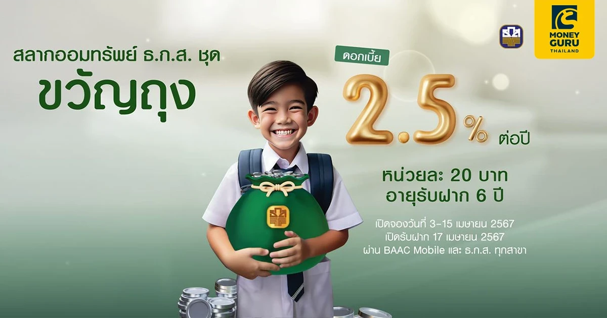 ธนาคารเพื่อการเกษตรและสหกรณ์การเกษตร เปิดให้จอง "สลากออมทรัพย์ ธ.ก.ส. ชุดขวัญถุง" ส่งเสริมการออมสำหรับนักเรียน นักศึกษา อายุ 7-18 ปีบริบูรณ์ ลุ้นรางวัลพิเศษ 1 แสนบาท โดยการเปิดจองฝากสลากฯ แอปพลิเคชัน BAAC Mobile และ ธ.ก.ส. ทุกสาขา