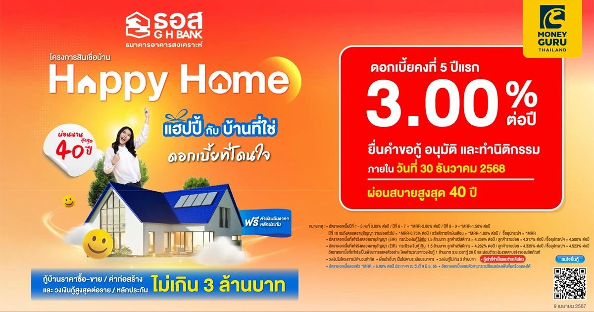 ที่ประชุมคณะรัฐมนตรี (ครม.) เห็นชอบให้ ธนาคารอาคารสงเคราะห์ (ธอส.) ดำเนินการตามนโยบายรัฐบาล และกระทรวงการคลัง ในการสนับสนุนคนไทยให้มีที่อยู่อาศัยเป็นของตนเองและลดความเหลื่อมล้ำทางสังคมผ่านการผ่อนชำระเงินงวดที่เหมาะสมกับสินเชื่อเพื่อที่อยู่อาศัยอัตราดอกเบี้ยต่ำใน "โครงการสินเชื่อบ้าน Happy Home" กรอบวงเงิน 20,000 ล้านบาท สำหรับผู้ที่ต้องการซื้อ หรือ ปลูกสร้างที่อยู่อาศัยในระดับราคาไม่เกิน 3 ล้านบาท อัตราดอกเบี้ยคงที่ 5 ปีแรก เพียง 3.00% ต่อปี ระยะเวลาผ่อนชำระสูงสุดนาน 40 ปี ผู้ที่สนใจสามารถรับรหัสเข้าร่วมโครงการ ผ่าน Mobile Application : GHB ALL GEN ตั้งแต่วันที่ 9 เมษายน 2567 เวลา 15.00 น. และยื่นขอสินเชื่อที่สาขาธนาคารทั่วประเทศ