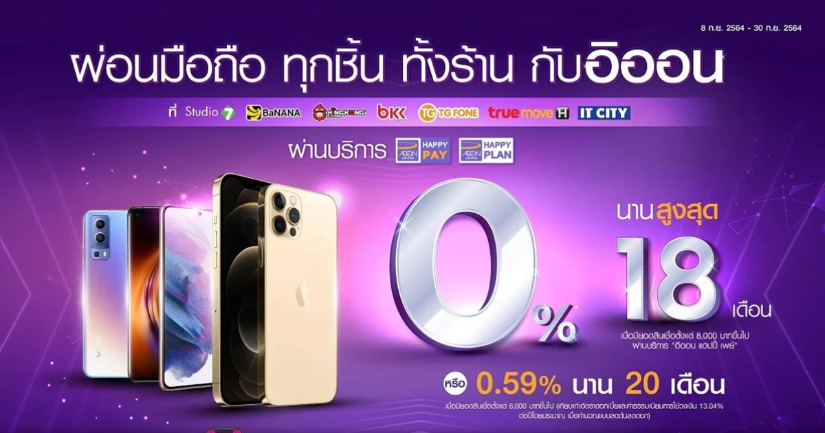 ผ่อนมือถือ ทุกชิ้น ทั้งร้าน กับอิออน ดอกเบี้ย 0% นานสูงสุด 18 เดือน วันนี้ - 30 ก.ย. 64