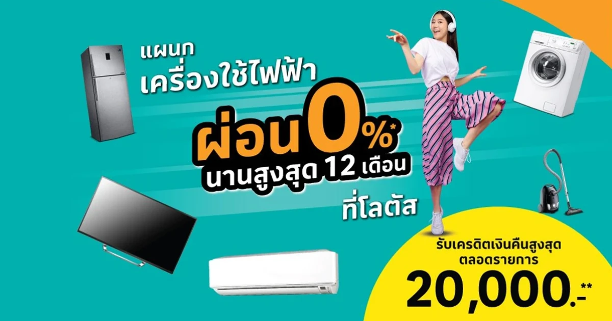 บัตรสินเชื่อโลตัส พรีเมียร์ ผ่อนเครื่องใช้ไฟฟ้า 0% นานสูงสุด 12 เดือน เฉพาะสินค้าที่ร่วมรายการ ที่แผนกเครื่องใช้ไฟฟ้า โลตัส สาขาที่ร่วมรายการ