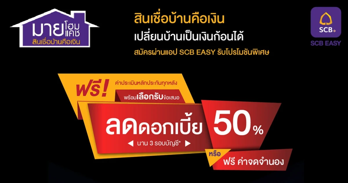 รับข้อเสนอพิเศษ ฟรี ค่าประเมินหลักประกันทุกหลัง พร้อมเลือกรับข้อเสนอเลือกรับส่วนลดดอกเบี้ย 50% นาน 3 รอบบัญชี หรือ ฟรีค่าจำนอง เมื่อสมัครสินเชื่อผ่านแอป SCB EASY ระหว่างวันที่ 1 กรกฎาคม 2564 - 30 กันยายน 2564 และ ได้รับการอนุมัติและเบิกจ่ายวงเงินสินเชื่อภายใน 10 วันทำการ นับจากวันที่ 30 กันยายน 2564
