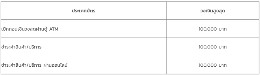 ธนาคารได้ทำการกำหนดวงเงินสูงสุดในการทำธุรกรรมต่างๆ ของบัตรกดเงินสด KKP Cash Card ต่อวัน ดังนี้
