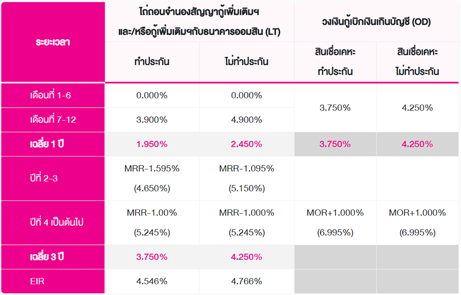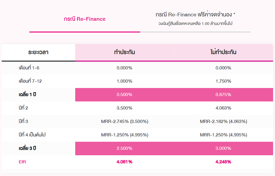- อัตราดอกเบี้ยที่แท้จริงตลอดอายุสัญญา (EIR) คำนวณจาก วงเงินกู้ 1,000,000 บาท ระยะเวลาผ่อนชำระ 20 ปี แบบผ่อนชำระเท่ากันทุกงวด