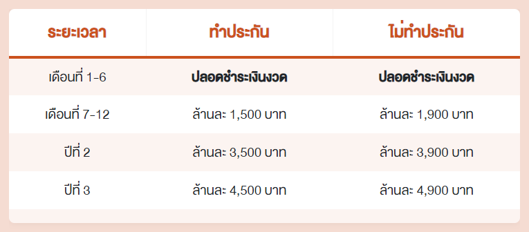 - แบ่งเบาภาระการผ่อนบ้าน ปลอดการชำระเงินต้นและดอกเบี้ยสูงสุด 6 เดือนแรก ผ่อนต่ำปีแรกล้านละ 1,500 บาทต่อเดือน