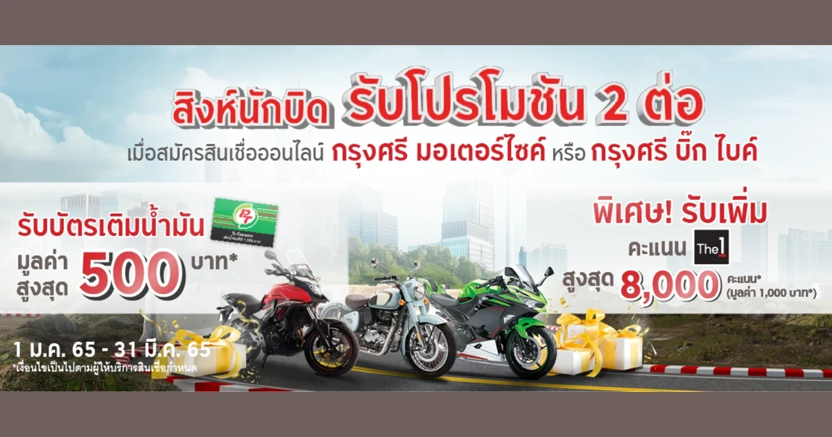 - ขอสงวนสิทธิ์สำหรับลูกค้าที่สมัครสินเชื่อ กรุงศรี มอเตอร์ไซค์ หรือ กรุงศรี บิ๊ก ไบค์ ผ่านช่องทางออนไลน์ระหว่าง วันที่ 1 มกราคม 2565 - 30 เมษายน 2565 พร้อมทั้งได้รับอนุมัติเป็นเลขที่สัญญาและรับรถภายในวันที่ 31 พฤษภาคม 2565 เท่านั้น