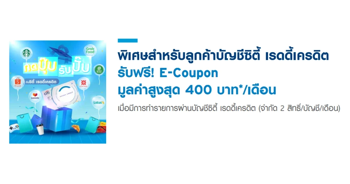 รับฟรี! E-Coupon มูลค่าสูงสุด 400 บาท*/เดือน พิเศษสำหรับลูกค้าบัญชีซิตี้ เรดดี้เครดิต เมื่อมีการทำรายการผ่านบัญชีซิตี้ เรดดี้เครดิต (จำกัด 2 สิทธิ์/บัญชี/เดือน)