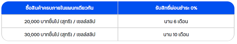 • ยอดซื้อสินค้าเพื่อรับสิทธิ์ผ่อนชำระ 0% นานสูงสุด 10 เดือน ต้องเป็นยอดซื้อหลังจากหักส่วนลดต่าง ๆ แล้ว (Net Sales)