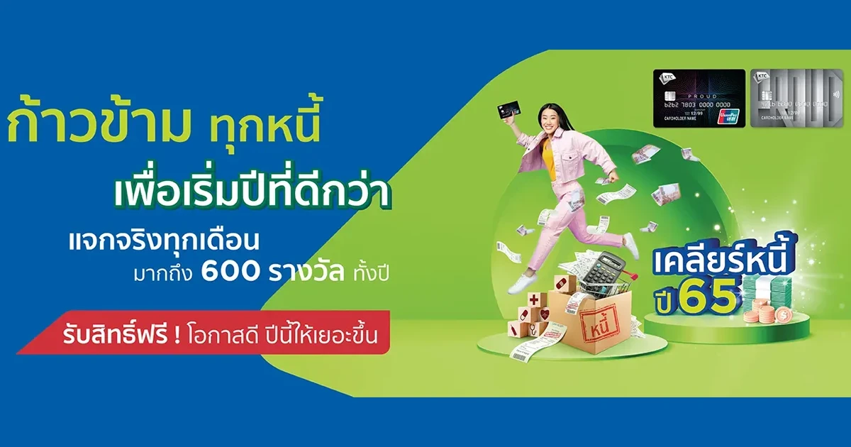 เคลียร์หนี้ ปี 65 กับ KTC PROUD เคลียร์หนี้เกลี้ยงรอบใหม่ แจกเยอะขึ้น แจกง่ายกว่าเดิม มีหนี้ล้านเคลียร์ให้ล้าน ใช้ดี รับ 1 สิทธิ์ เมื่อโอนเงิน กดเงิน รูดซื้อสินค้า หรือผ่อนสินค้า ทุกๆ 2,000 บาท คงค้าง 15 วัน ไม่จำกัดจำนวนสิทธิ์ได้สิทธิ์ไม่อั้น จ่ายดี รับ 1 สิทธิ์ เมื่อจ่ายตรงตามเวลาเรียกเก็บ
