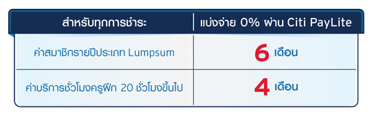 • แบ่งจ่ายดอกเบี้ย 0% 4 เดือน และ 6 เดือน สำหรับทุกการชำระค่าสมาชิกหรือค่าบริการตามที่กำหนด โดย Fitness First และ/หรือ Celebrity Fitness