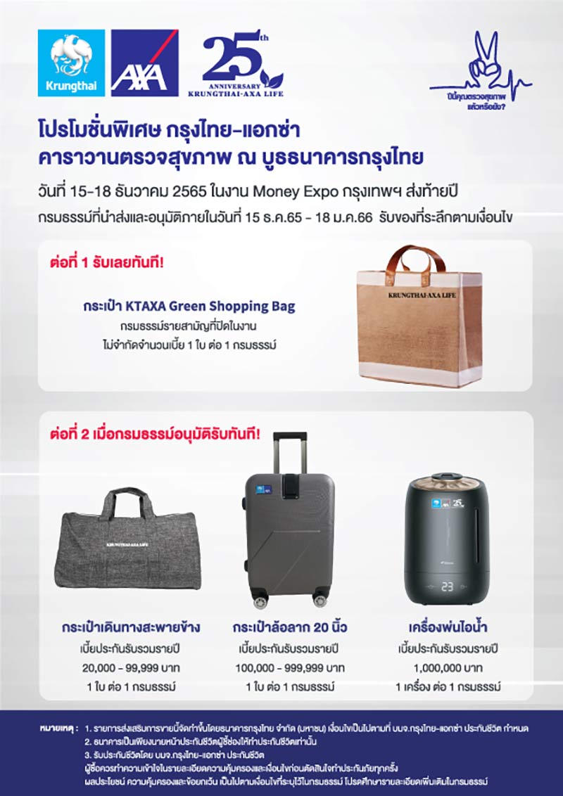 โปรโมชันพิเศษ กรุงไทย-แอกซ่า คาราวานตรวจสุขภาพ ณ บูธธนาคารกรุงไทย : กรมธรรม์ที่นำส่งและอนุมัติภายในวันที่ 15 ธ.ค. 65 - 18 ม.ค. 66 รับของที่ระลึกตามเงื่อนไข