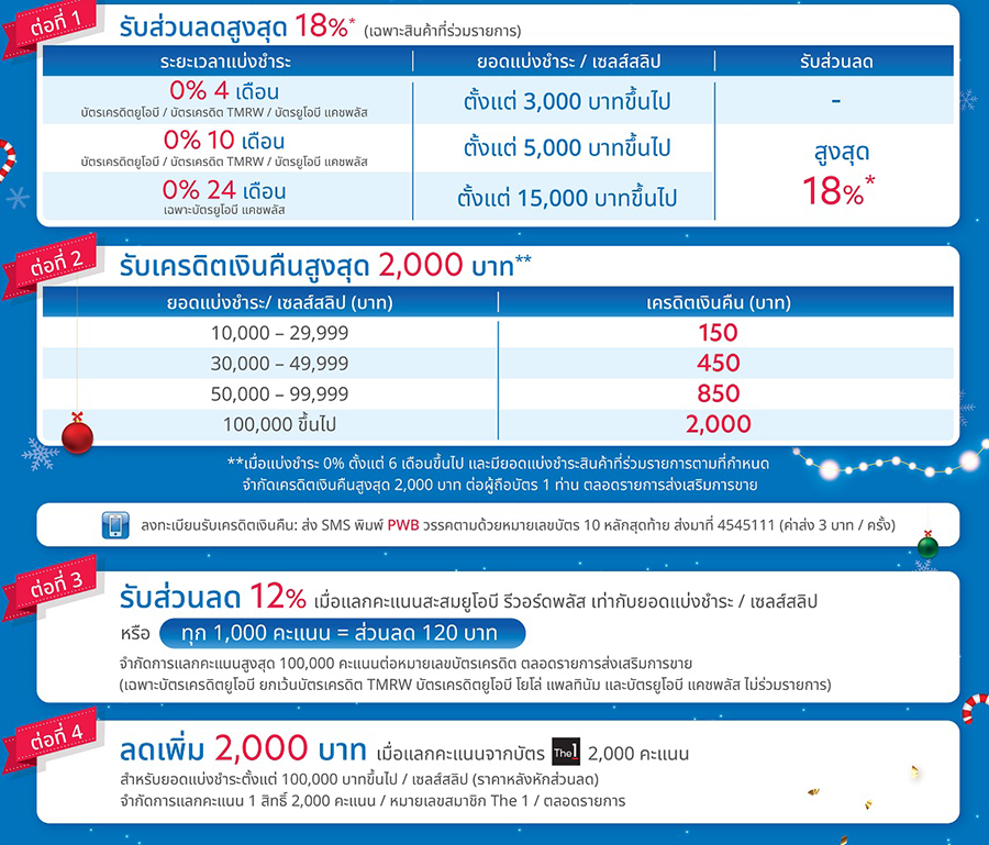 2. แบ่งชำระ 0% 4 เดือน, 6 เดือน หรือ 10 เดือน สำหรับบัตรเครดิตยูโอบี / บัตรเครดิต TMRW หรือแบ่งชำระ 0% 4 เดือน, 6 เดือน, 10 เดือน หรือ 24 เดือน สำหรับบัตรยูโอบี แคชพลัส เมื่อมียอดแบ่งชำระตั้งแต่ 3,000 / 5,000 / 15,000 บาทขึ้นไป ต่อเซลส์สลิป (เฉพาะสินค้าที่ร่วมรายการ) ตามรายละเอียดที่ระบุไว้ในตารางต่อที่ 1 ด้านหน้าสื่อโฆษณา