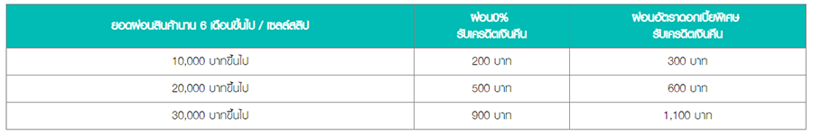 3. ยอดเครดิตเงินคืนจะคำนวณจากยอดผ่อนชำระตั้งแต่ 10,000 บาทขึ้นไป/ เซลล์สลิป/ชิ้น และผ่อนชำระนาน 6 เดือนขึ้นไป เท่านั้น