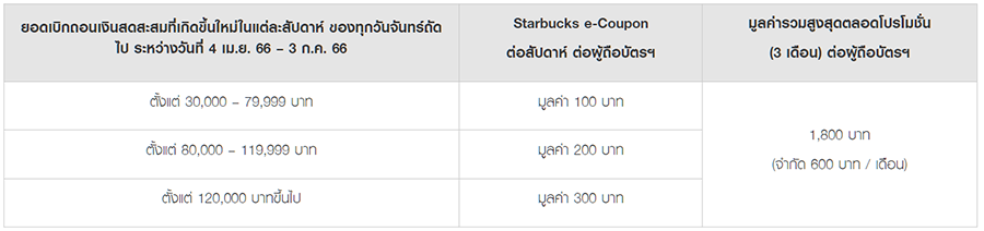 • จำกัดการรับ Starbucks e-Coupon สูงสุด 600 บาท / ผู้ถือบัตรฯ / เดือน และจำกัดการรับ Starbucks e-Coupon รวมสูงสุด 1,800 บาท / ผู้ถือบัตรฯ / ตลอดรายการส่งเสริมการขาย