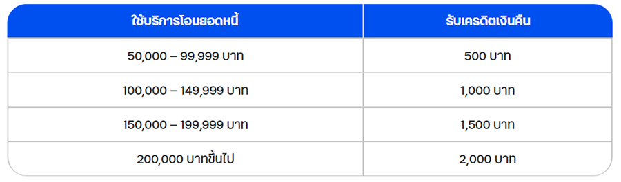 โปรโมชันพิเศษ รับเครดิตเงินคืนเข้าบัญชีสูงสุดถึง 2,000 บาท เมื่อใช้บริการโอนยอดหนี้ตามเงื่อนไขที่กำหนด