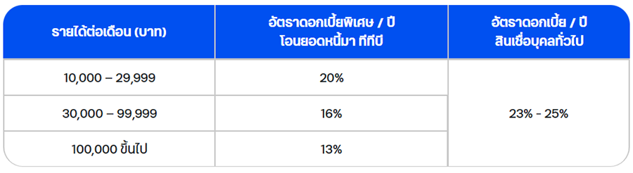 • ประหยัดค่าดอกเบี้ย ด้วยอัตราดอกเบี้ยเริ่มต้นเพียง 13%ต่อปี