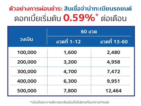 หมายเหตุ : ธนาคารขอสงวนสิทธิ์ในการกำหนดวงเงิน อัตราดอกเบี้ย ระยะเวลาผ่อนชำระ และผู้ค้ำประกัน โดยพิจารณาจากยี่ห้อ รุ่น ปีที่จดทะเบียนของรถ รวมถึงรายได้และสถานภาพต่างๆ ของผู้สมัคร ภายใต้หลักเกณฑ์การพิจารณาสินเชื่อของทางธนาคาร