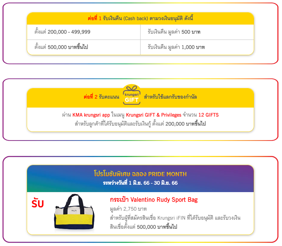 ระหว่างวันที่ 1 มกราคม 2566 - 30 มิถุนายน 2566 โดยได้รับอนุมัติและรับเงินกู้ โดยวิธีโอนเงินเข้าบัญชีเงินฝากธนาคารกรุงศรีอยุธยาตามเงื่อนไขที่กำหนด ภายในวันที่ 31 กรกฎาคม 2566 จะได้รับสิทธิพิเศษ ดังนี้