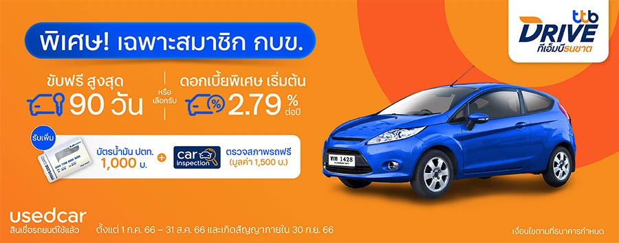 ออกรถยนต์มือสองพร้อมสมัครสินเชื่อรถยนต์ใช้แล้ว ทีทีบีไดรฟ์ ตั้งแต่ 1 กรกฎาคม 2566 - 31 สิงหาคม 2566 อนุมัติและเกิดสัญญาภายในวันที่ 30 กันยายน 2566 รับสิทธิพิเศษดังนี้
