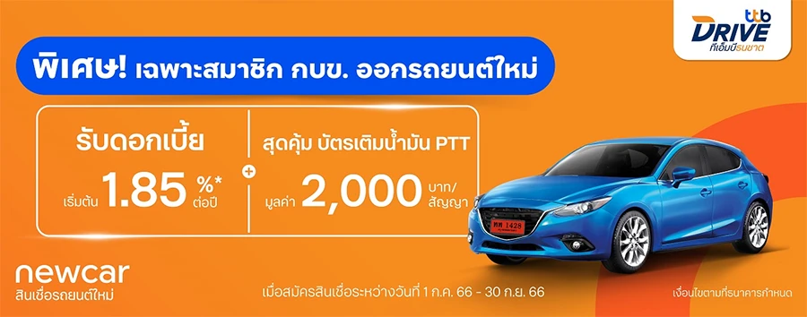 พิเศษรับเพิ่ม! บัตรน้ำมัน PTT มูลค่า 2,000 บาท/สัญญา เมื่อสมัครสินเชื่อรถยนต์ใหม่ ทีทีบีไดรฟ์ ตั้งแต่วันที่ 1 ก.ค. - 30 ก.ย. 66 และได้รับอนุมัติเป็นสัญญาภายในวันที่ 31 ธ.ค. 66