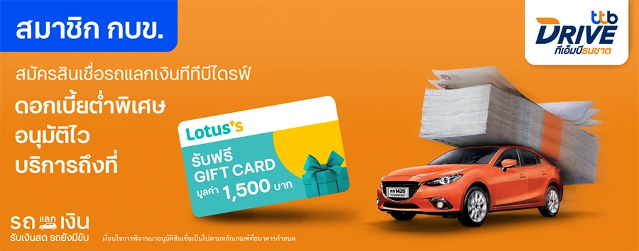 ต้องการเงินด่วน นำรถมาแลกเงิน กับสินเชื่อรถแลกเงิน ทีทีบีไดรฟ์ ตั้งแต่ 1 กรกฎาคม 2566 – 31 ธันวาคม 2566 รับฟรี! บัตรของขวัญ โลตัส มูลค่า 1,500 บาท/สัญญา