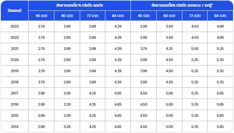 - สำหรับรถยนต์ยี่ห้ออื่นๆ (Other Brand) ที่ไม่ได้ร่วมรายการ ระยะเวลาผ่อนชำระสูงสุดไม่เกิน 84 งวด (7 ปี) ให้บวกอัตราดอกเบี้ย 0.75%ต่อปี จากตารางข้างต้น