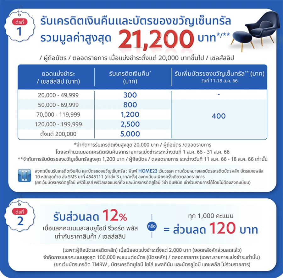 - ผู้ถือบัตรต้องลงทะเบียนทาง SMS พิมพ์ HOME23 เว้นวรรค ตามด้วยหมายเลขบัตรเครดิตบัตรหลัก/บัตรแคชพลัส 10 หลักสุดท้าย ส่งไปที่ 4545111 (ค่าส่ง SMS 3 บาท /ครั้ง) ลงทะเบียนเพียงครั้งเดียวตลอดรายการ (ยกเว้นบัตรเครดิตยูโอบี พรีวิไมลส์ พริวิเลจแบงก์กิ้ง และบัตรเครดิตยูโอบีวีซ่า อินฟินิท เข้าร่วมรายการได้โดยไม่ต้องลงทะเบียน)