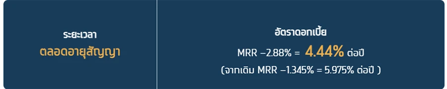 อัตราดอกเบี้ยลอยตัว MRR -2.88% ต่อปี (MRR = 7.32% ต่อปี ณ วันที่ 6 มิ.ย. 66)