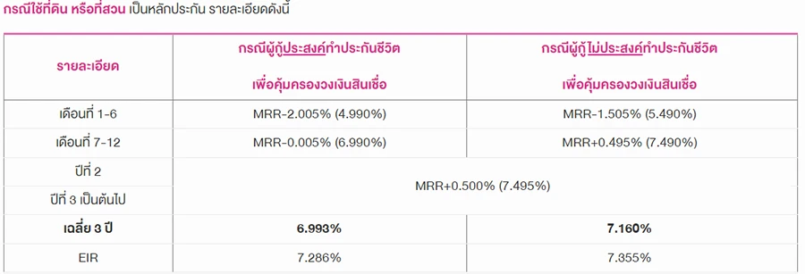 • อัตราดอกเบี้ยที่แท้จริงตลอดอายุสัญญา (EIR) คำนวณจาก วงเงินกู้ 1.00 ล้านบาท ระยะเวลาชำระเงินกู้ 20 ปี