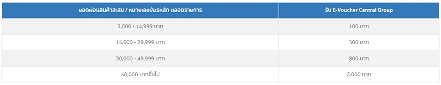 - มียอดผ่อนชำระสินค้าขั้นต่ำ 3,000 บาท / ใบเสร็จ ณ ร้านค้าในเครือ เซ็นทรัล กรุ๊ป ที่ร่วมรายการ ภายใน 30 วันนับจากวันอนุมัติบัตร