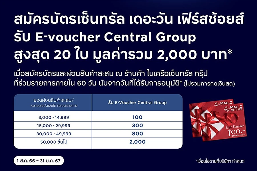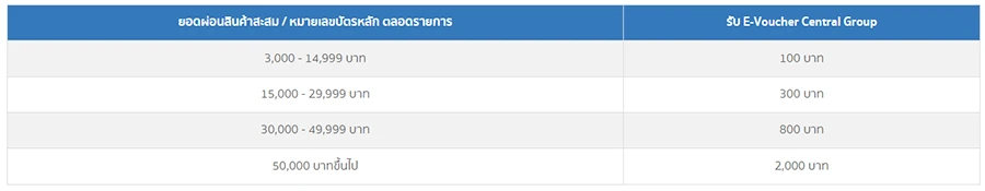 - สงวนสิทธิ์รับ E-Voucher Central Group มูลค่า 100 บาท สูงสุด 20 ใบ มูลค่ารวม 2,000 บาท / หมายเลขบัตรหลักตลอดรายการ