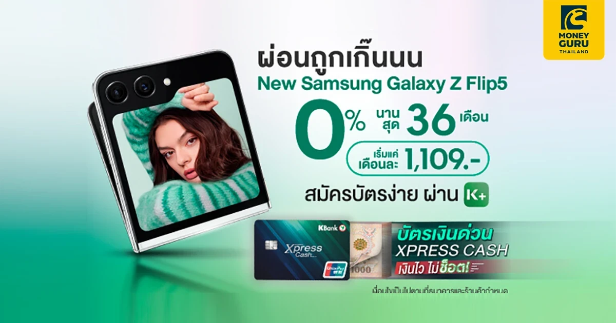 สิทธิพิเศษเฉพาะลูกค้าบัตรเงินด่วน Xpress Cash เท่านั้น ใช้บัตรผ่อนมือถือ New Samsung Galaxy Z Flip 5 ฟรีดอกเบี้ย 0% ได้นานถึง 36 เดือน ทุกสาขาที่ร่วมรายการ ใครยังไม่มีบัตรกดสมัครได้เลย