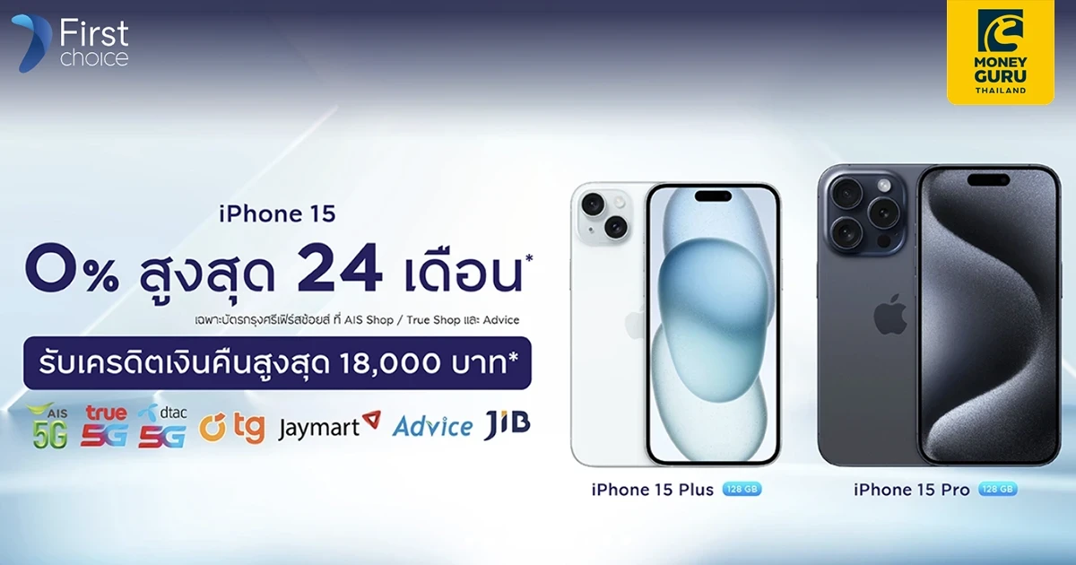 ผ่อนชิลล์ยาว 0% ทั้ง ไอโฟน 15, ไอโฟน 15 พลัส, ไอโฟน 15 Pro, ไอโฟน 15 Pro Max ทุกรุ่น ทุกความจุ ที่ช็อปมือถือชั้นนำ AIS, TrueMove H, dtac, Jaymart, TG Fone, Advice, J.I.B.