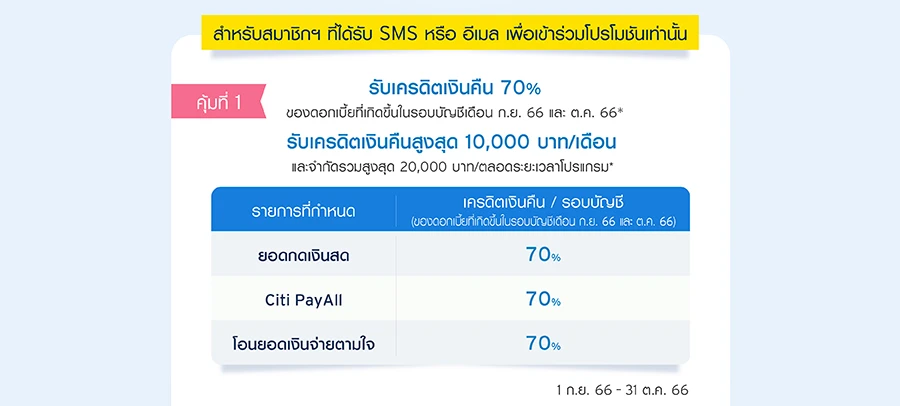 • สำหรับสมาชิกบัญชีซิตี้ เรดดี้เครดิต ที่ได้รับ SMS หรืออีเมลเพื่อเข้าร่วมโปรโมชันเท่านั้น