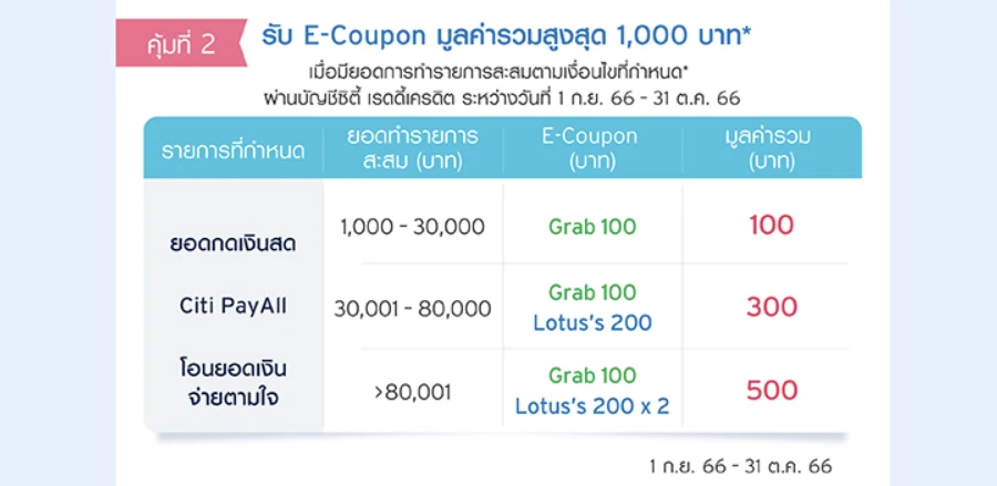 • รับ Grab E-Coupon มูลค่า 100 บาท และ Lotus’s E-Coupon 200 บาท เมื่อมียอดการทำรายการสะสมจากรายการ กดเงินสด / Citi PayAll / โอนยอดเงินจ่ายตามใจ ตั้งแต่ 30,001 - 80,000 บาท